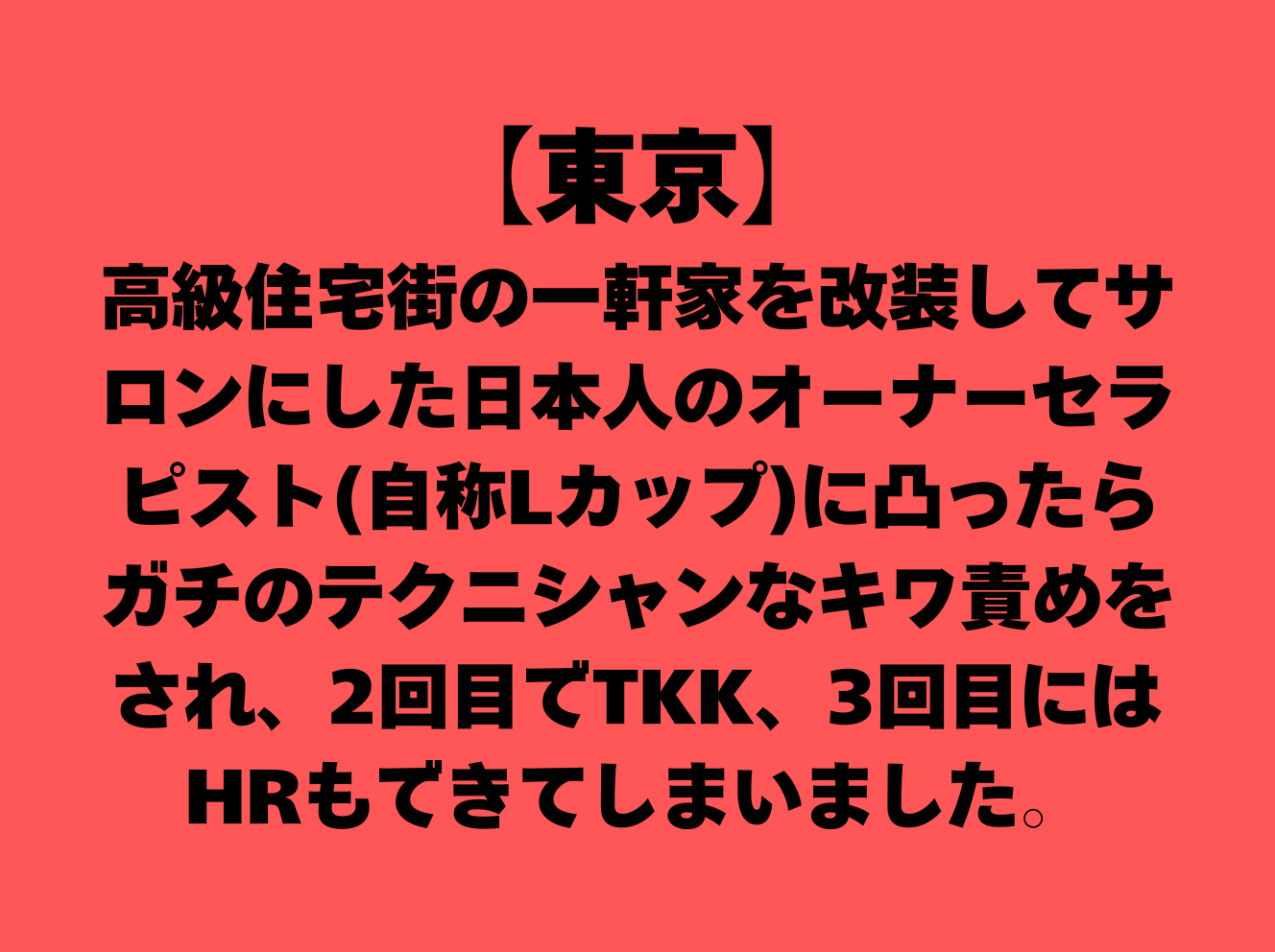『高級住宅街の一軒家を改装してサロンにした日本人のオーナーセラピスト(自称Lカップ)に凸ったらガチのテクニシャンなキワ責めをされ、2回目でTKK、3回目にはHRもできてしまいました』