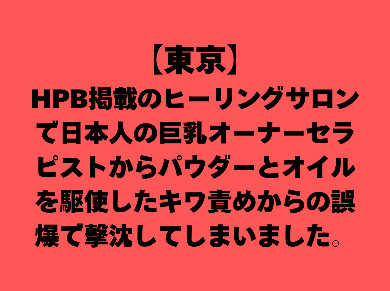 『HPB掲載のヒーリングサロンで日本人の巨乳オーナーセラピストからパウダーとオイルを駆使したキワ責めからの誤爆で撃沈してしまう』