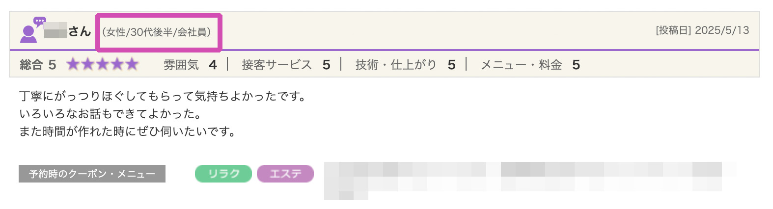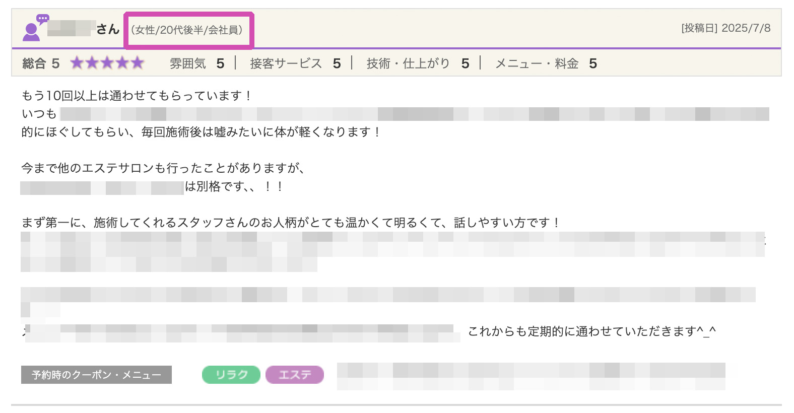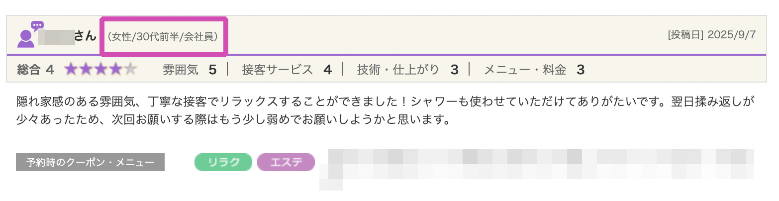 20代女性からの口コミこそこのくらいですが、30代女性からの口コミもいくつか掲載されており、いずれにせよ女性客からも支持されているサロンなのが伝わってきます。