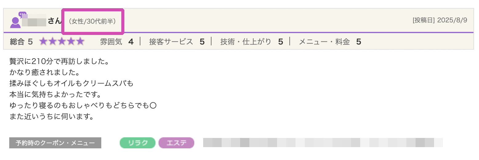 それでこのサロン、私以外にも普通に男性客の利用もあるようですが、HPB上の口コミを見ると、「20代女性」も利用しているのが分かります。