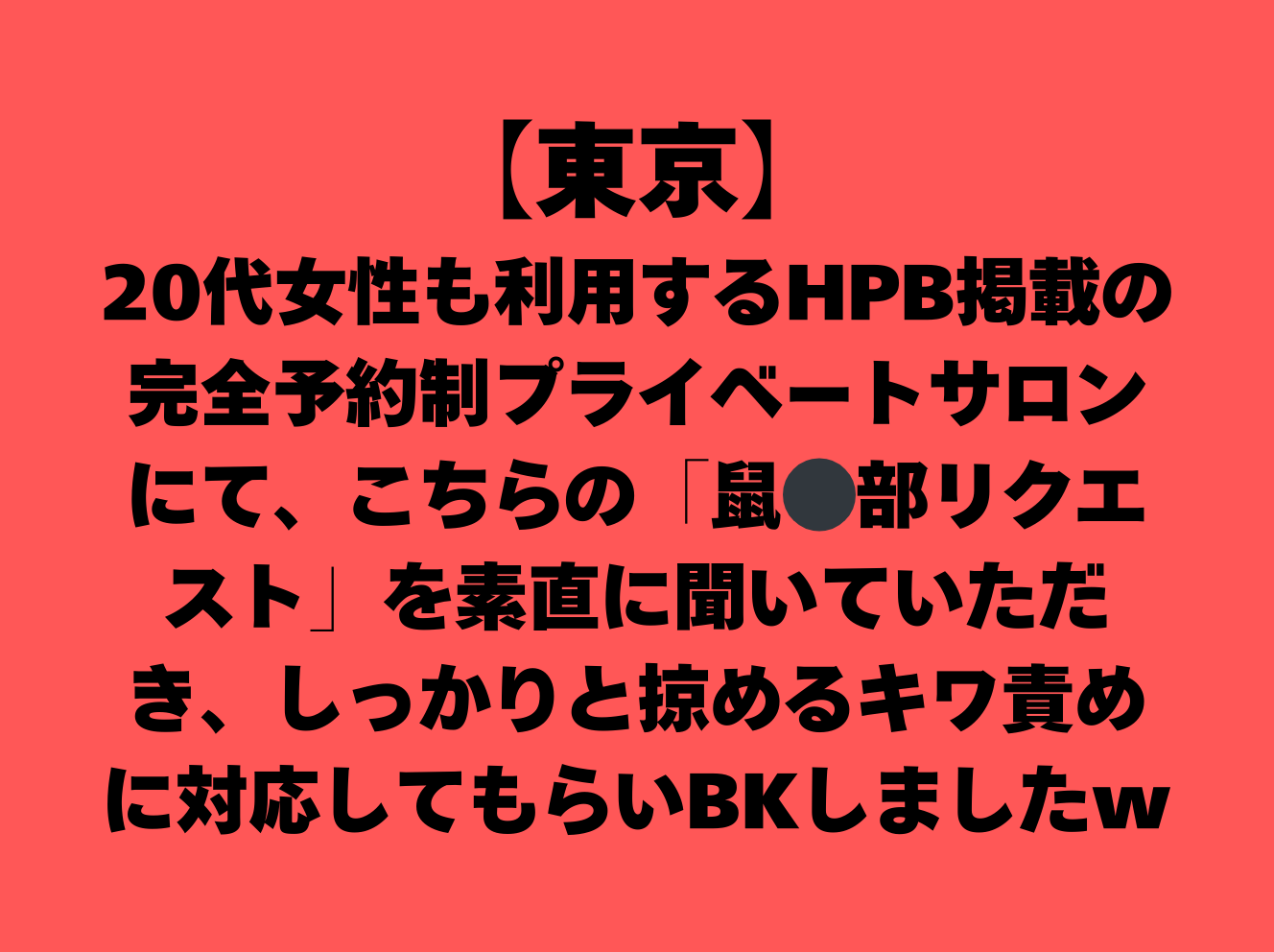 『20代女性も利用するHPB掲載の完全予約制プライベートサロンにて、こちらの「鼠⚫︎部リクエスト」を素直に聞いていただき、しっかりと掠めるキワ責めに対応してもらいBKした』