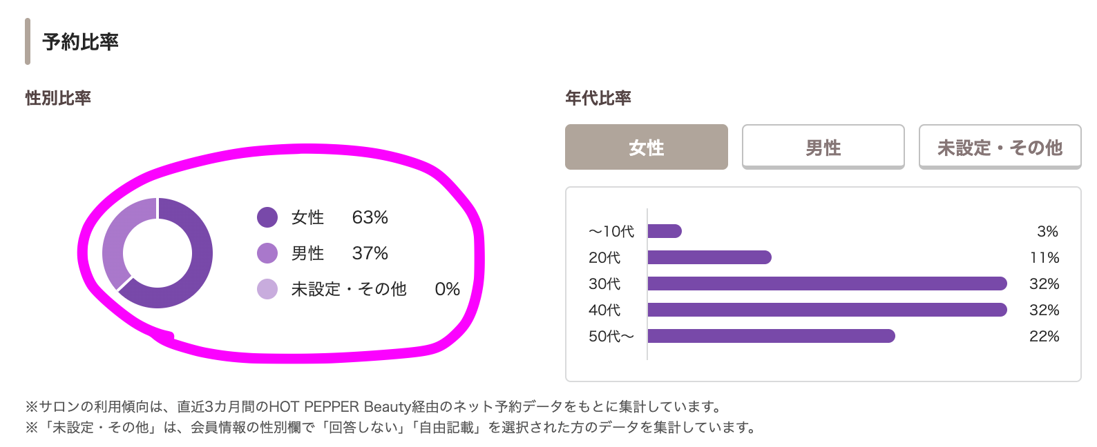 このような感じで、女性客が63%ほどと、やっぱり女性客がメインターゲットなのは間違いないものの、少なからず男性客も利用していることが判明しました。