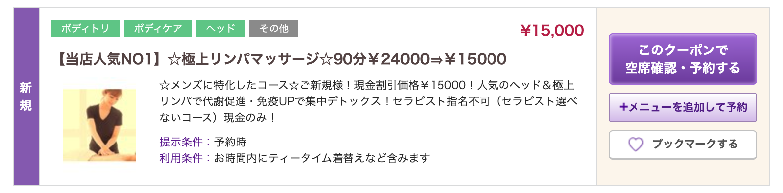 単にリンパマッサージとするのではなく、「極上」と銘打ってるあたりにやけにドキドキしてしまう自分がおり、たまらずこの『極上リンパマッサージ』のメニューを予約しましたw